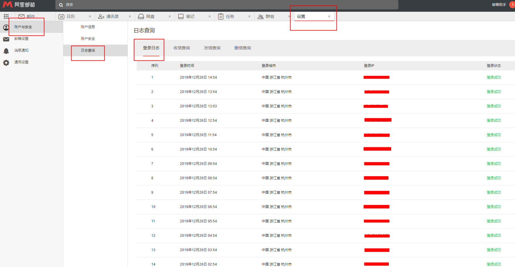 1、登录邮箱后点击右上角“邮箱设置”,在"账户与安全"-"日志查询"-““登陆日志”即可查看,最多可显示100条近30天内的登录日志。